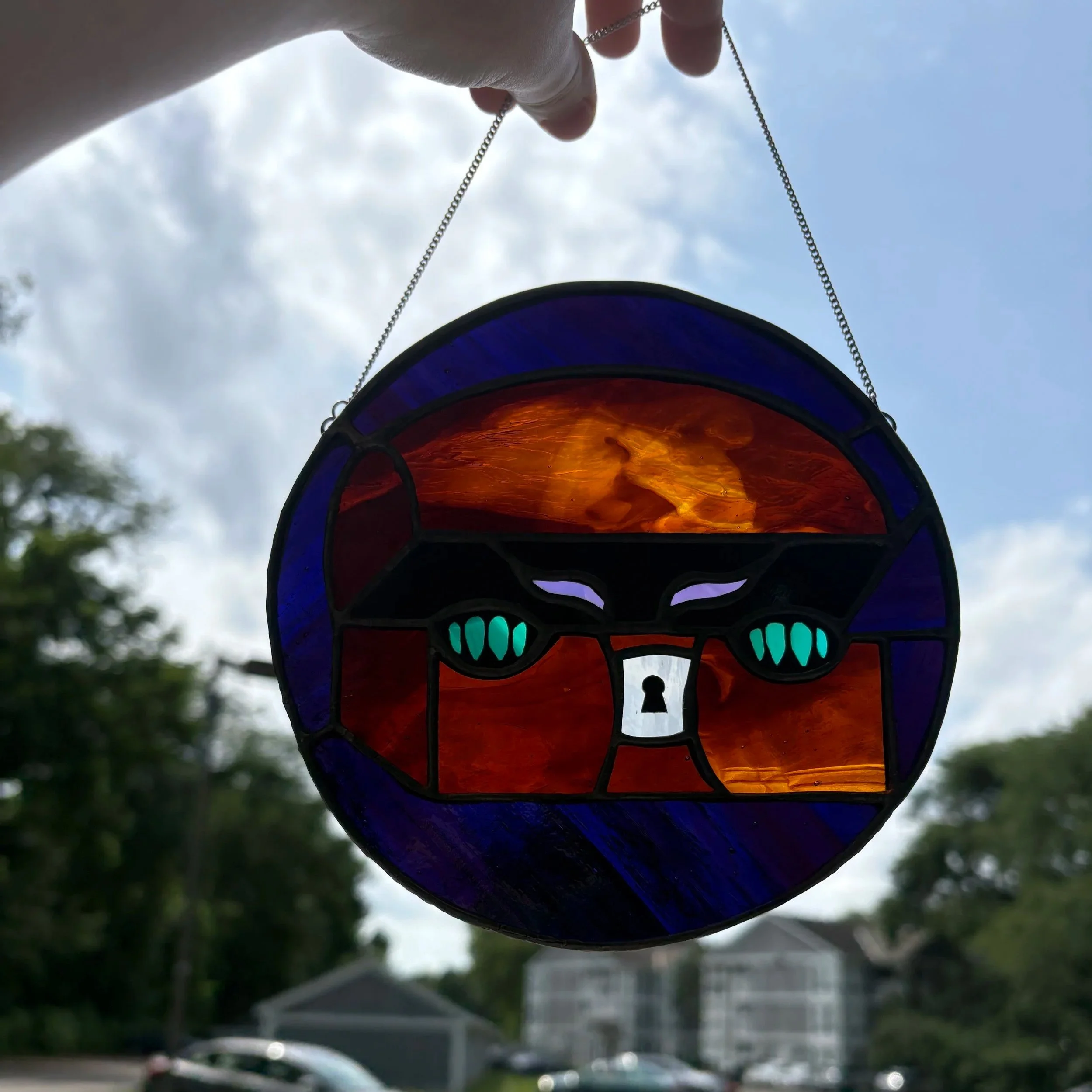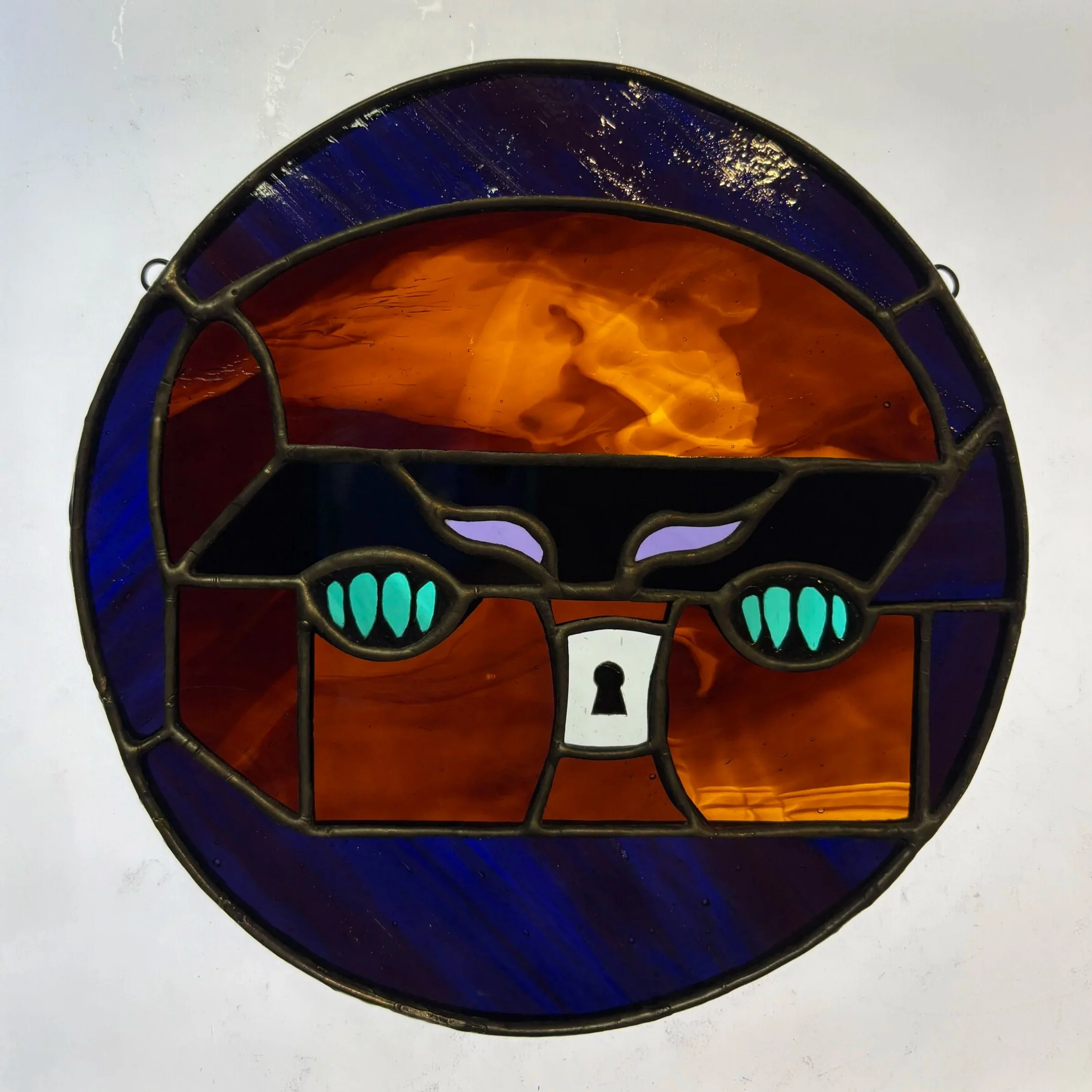 Handmade suncatcher, made using the Tiffany method of stained glass. Faux glass painting details are Pebeo Vitrea 160 paint, allowing permanent details while not fusing the paint with the glass. About 5 x 5”.